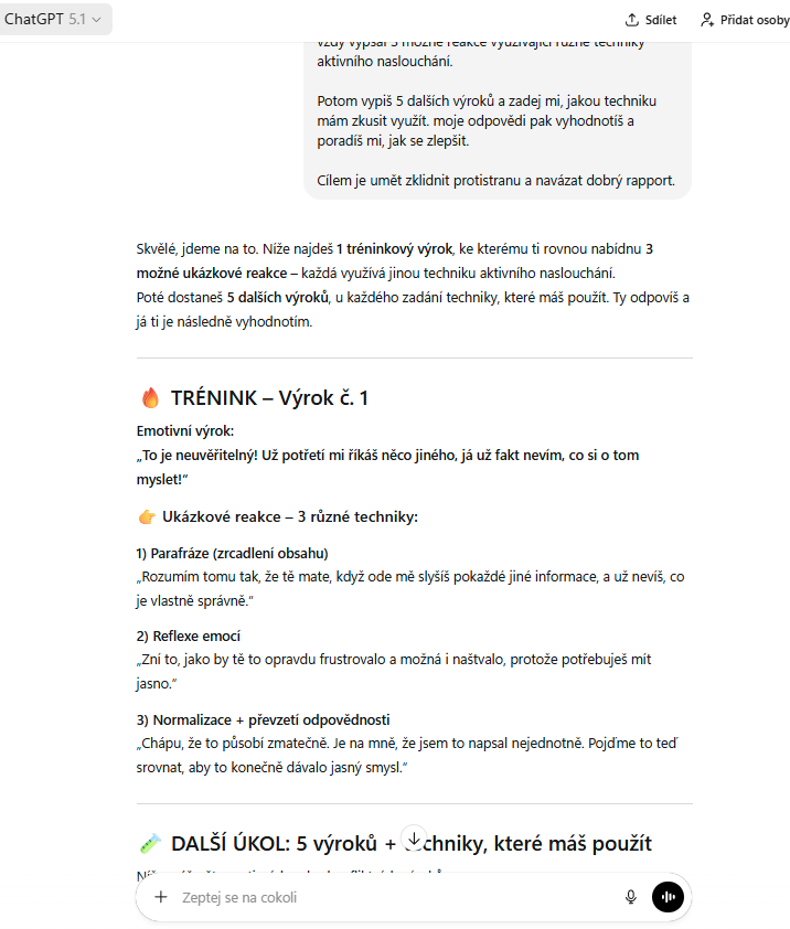 Na závěr tu máme radu pro ty, kteří by si chtěli potrénovat či se dozvědět víc o tom, jak obstát v emočně nabité situaci. Honza Kubíček, velký expert na trénink vyjednávání, který akci vedl, doporučuje pro usnadnění komunikace i vyjednávání natrénovat techniky aktivního naslouchání. Jako osobního trenažéra můžete např. využít tento prompt pro chatgt, gemini, grok apod.: